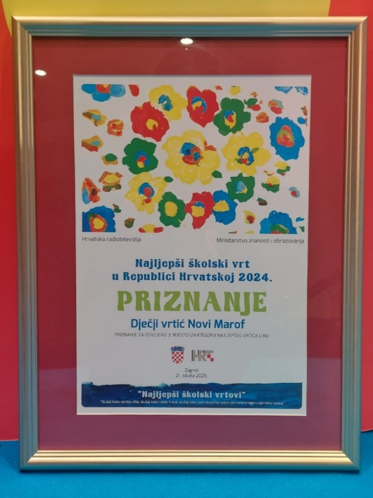 U sklopu projekta “Najljepši školski vrtovi”, u organizaciji HRT-a i Ministarstva znanosti, obrazovanja i mladih, s početkom proljeća u studiju HRT-a Zvonimir Bajsić u petak su dodijeljena priznanja za najljepši dječji vrtić u Hrvatskoj za 2024. godinu. Dječji vrtić Novi Marof osvojio je treće mjesto, a na svečanoj dodjeli priznanja su, uz ravnateljicu vrtića Karolinu Fotak, bile odgojiteljica Katarina Štaba i spremačica Anica Loborec.