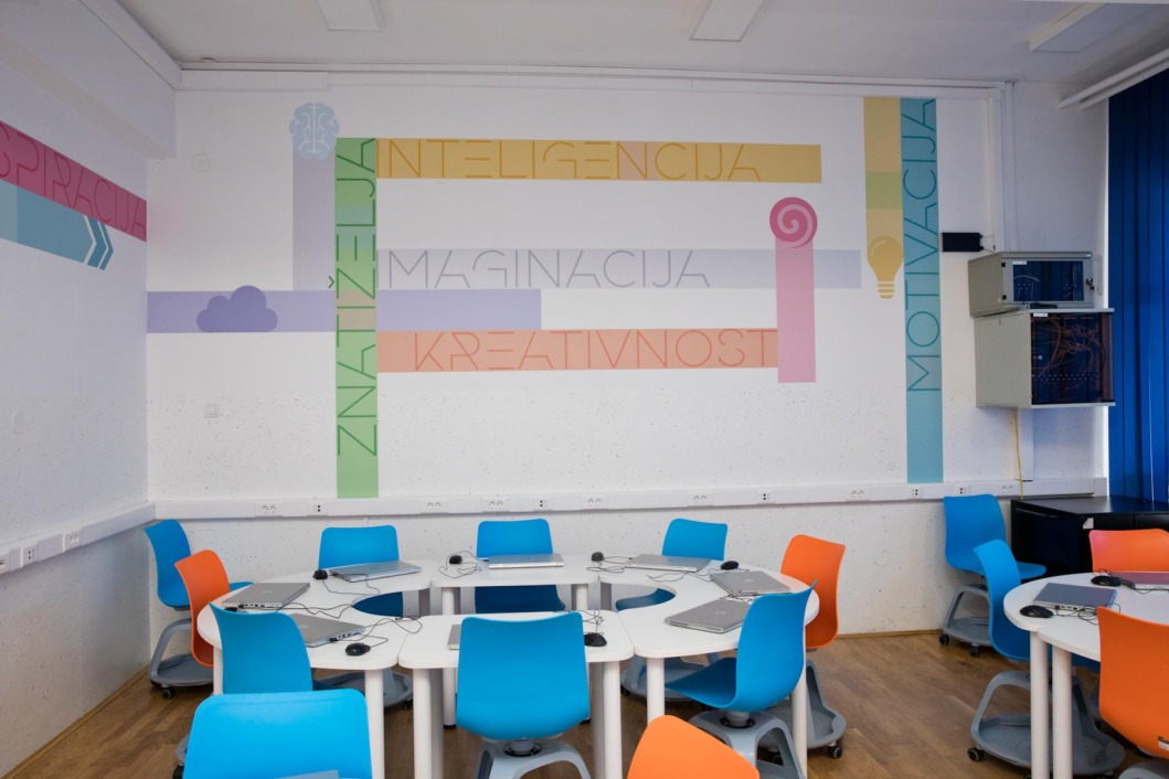 Učionica je osmišljena kao suvremeni prostor koji omogućuje učenicima učenje na način koji je prilagođen njihovim potrebama, interesima i tehnološkoj svakodnevici. Krasi je 21 posebno dizajniran i ergonomski prilagođen inovativni stolac, suvremeni stolovi koji zamjenjuju klasične školske klupe i pružaju veću fleksibilnost u radu, ali i električni učiteljski stol koji se može prilagođavati visinski.