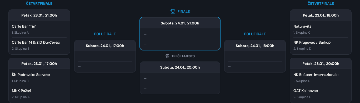 U četvrtfinalu, koje je na rasporedu u petak, igrat će ŠN Podravske Sesvete i MNK Požari (17 sati), Naturavita i NK Prugovac / Barkop (18 sati), NK Bušpan Internazionale i GAT Kalinovac (20 sati) te Caffe bar Tin i Caffe bar M & ZID Đurđevac (21 sat).