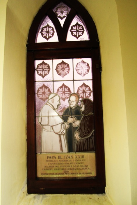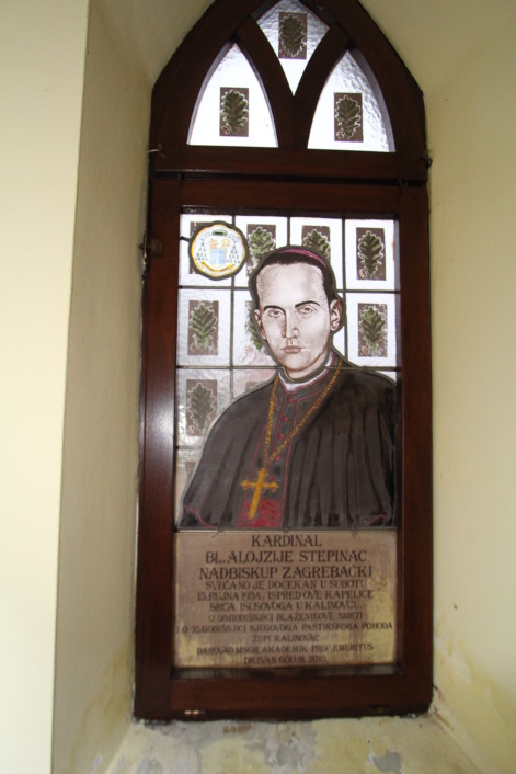 Na sjevernom se prozoru nalazi vitraj zagrebačkog nadbiskupa i blaženog Alojzija Stepinca koji je postavljen u prigodi 75. godišnjice njegovog pastoralnog posjeta kalinovačkoj župi u službi nadbiskupskog koadjutora i 50. godišnjice blaženikove smrti. Na južnom se prostoru nalazi vitraj s blaženikom papom Ivanom XXIII. koji je također imao kontakt sa župom Kalinovac preko kalinovačkog domaćeg sina msgr. prof. Ivana Goluba i njegove majke.