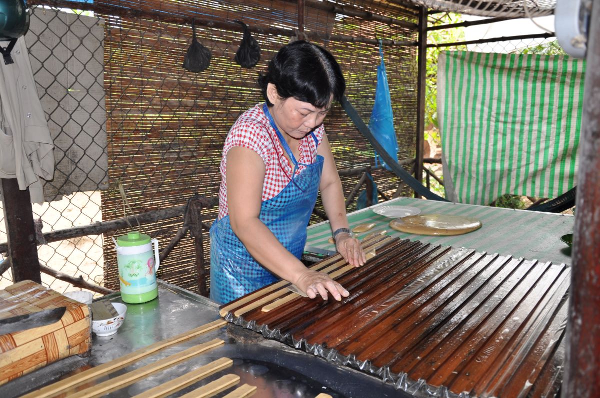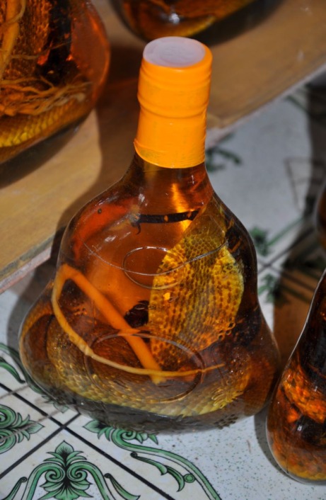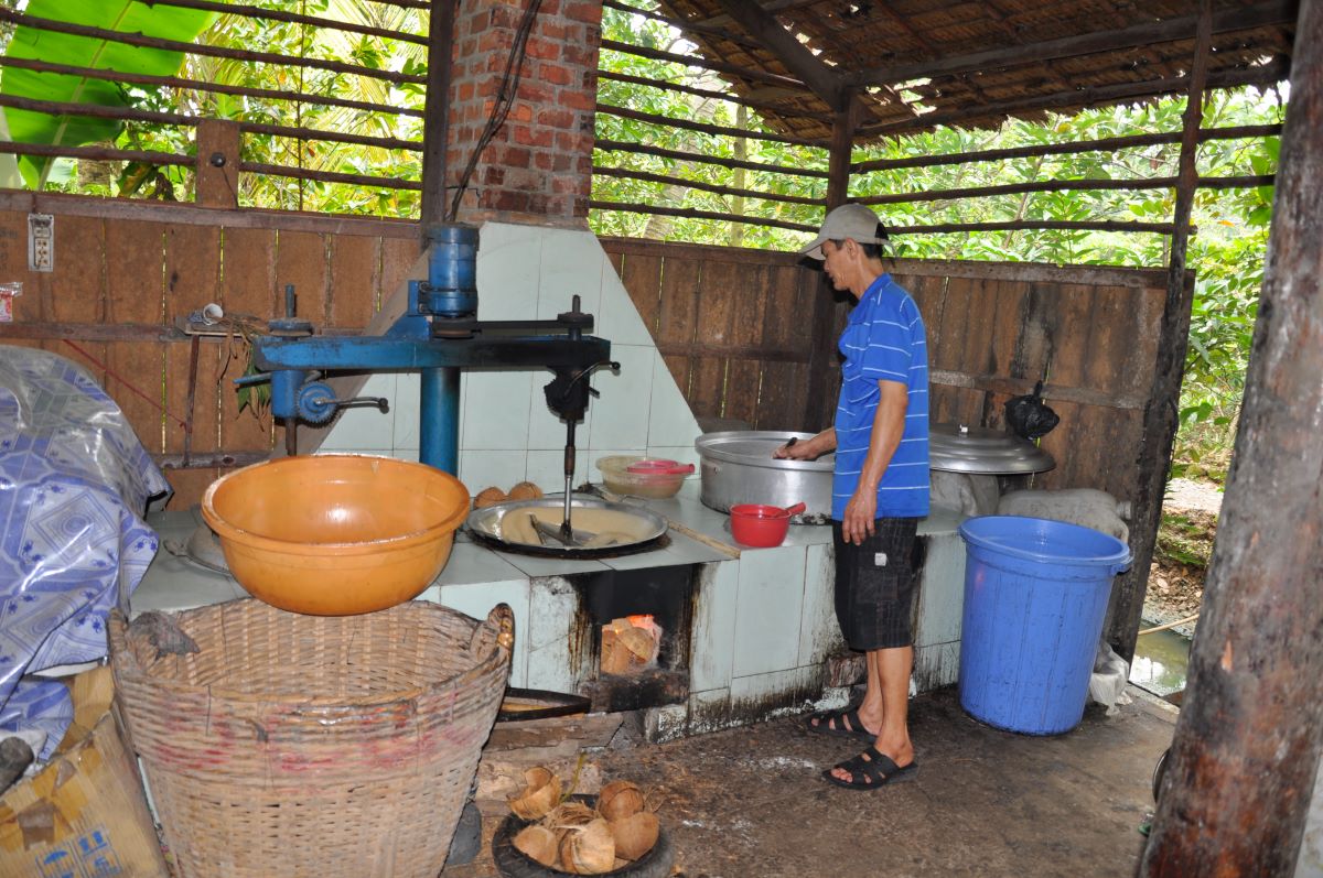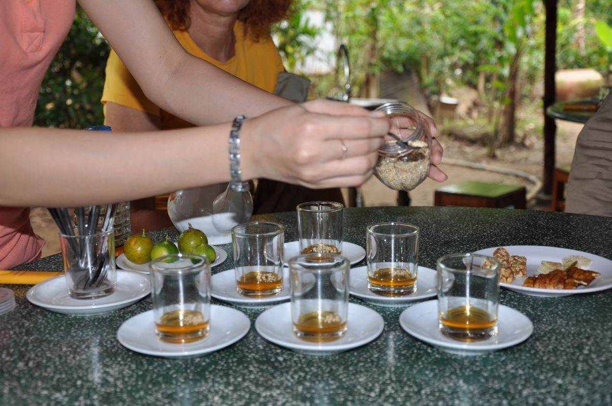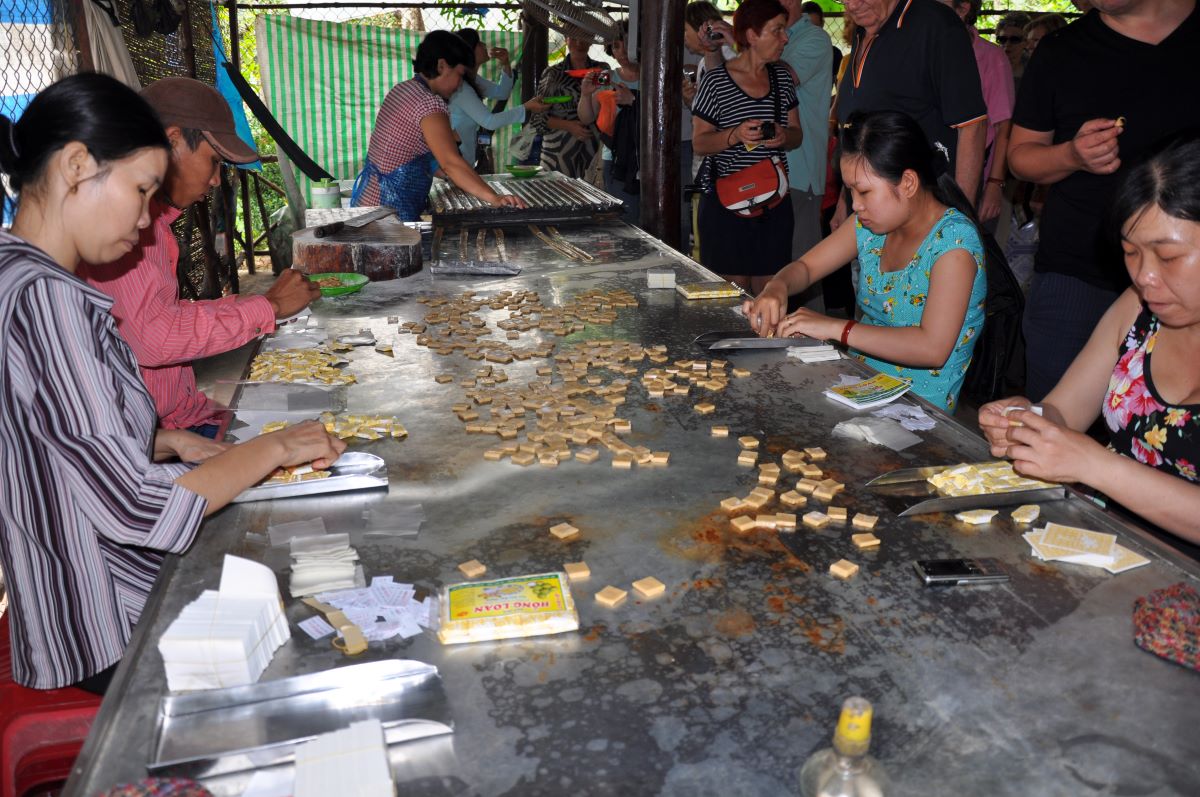 Put prema obližnjem rukavcu Mekonga vodi nas do male destilerije i slastičarnice na otvorenom gdje se proizvode odlični, domaći kolačići. Tu se prodaju alkoholna pića u koje se stavlja živa zmija kobra. Još mi ni dan danas nije jasno kako su kobrinu glavu ugurali kroz grlić boce. No ugurali su je neoštećenu. Nekoliko radnica reže i pakira kolačiće od đumbira prelivene medom. U jednom dijelu je Vijetnamac koji pravi i oblikuje tijesto. Stroj je zastarjela tehnologija no očito da dobro radi. Tijesto se oblikuje u 5 cm široke prutiće dugačke jedan metar, a radnica ih uredno posložene prelijeva medom.