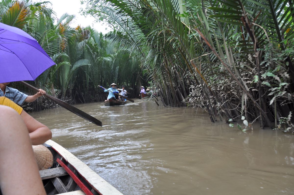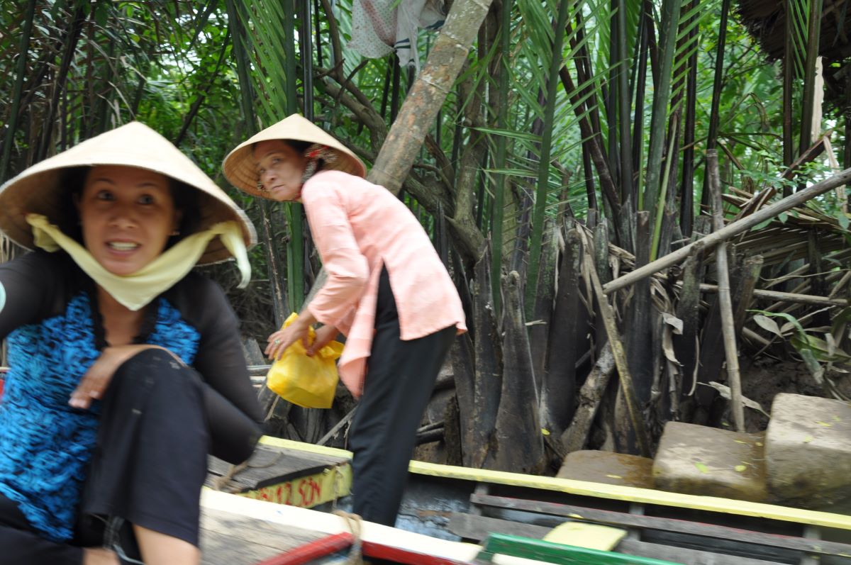 Zatim slijedi vožnja čamcima po rukavcima Mekonga. Vrlo uzbudljivo i neviđeno. Voda je mutna, blatnjava. Među veslačima je najviše žena. U turističkim prospektima su opisane kao vijetnamske žene veslačice. Ljubazno nas dočekuju. Hui nas je upozorio (i zamolio) da svakoj dademo po 1 euro kao napojnicu. Koliko sam shvatio, one veslaju i rade za poslodavca i za to dobivaju mjesečnu plaću. Dobiti koncesiju zasigurno je stvar korupcije ili vlasnik mora biti u komunističkoj partiji. Vijetnam se inače ubraja među najkorumpiranije zemlje svijeta. Pretpostavio sam da ženama – veslačicama plaća nije velika, jer su me već na pola puta zamolile da im dadem napojnicu.