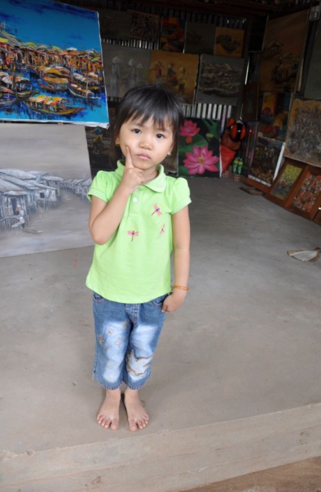 Malo podalje, mala, bucmasta Vijetnamka nas ljubopitljivo promatra, srami se, no kad je vidjela da su njezini kolege dobili bombone, rado nam pozira za snimanje. Mlada Vijetnamka sjedi na trijemu pored svoje kuće, radoznalo nas promatra. Svima smo mi kao stranci zanimljivi. Dobivam od nje dozvolu za snimanje.