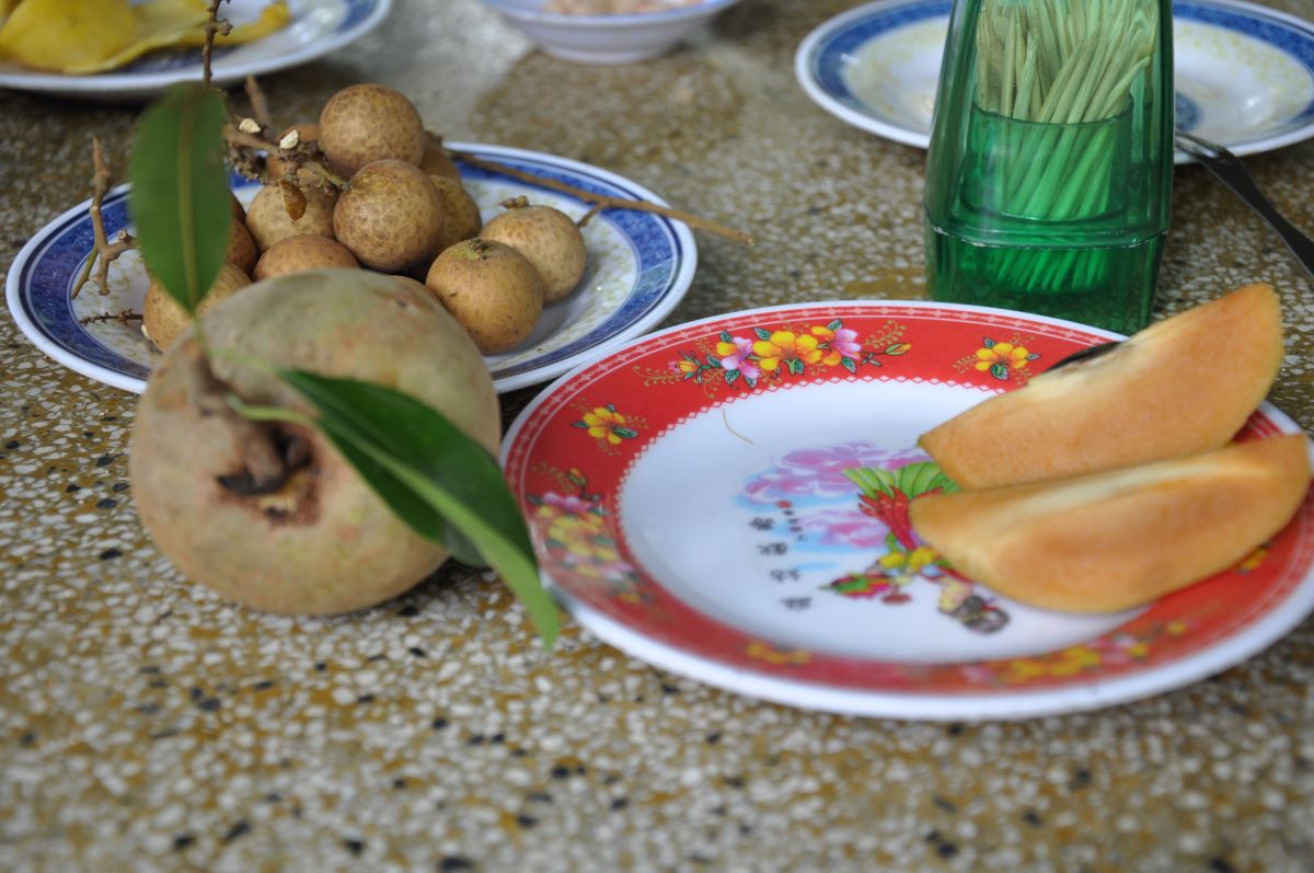 Doživjeli smo zaista lijepo gostoprimstvo. Pod drvenim trijemom prostrt je stol sa svakojakim egzotičnim voćem. Neko od voća nisam nikada vidio, niti sam znao kako se zove. Novostečeni prijatelj iz Vijetnama Hue poslao mi je je kasnije točan naziv nekih od njih. Mango i ananas su bez premca. Ostalo voće vidimo prvi puta u životu.