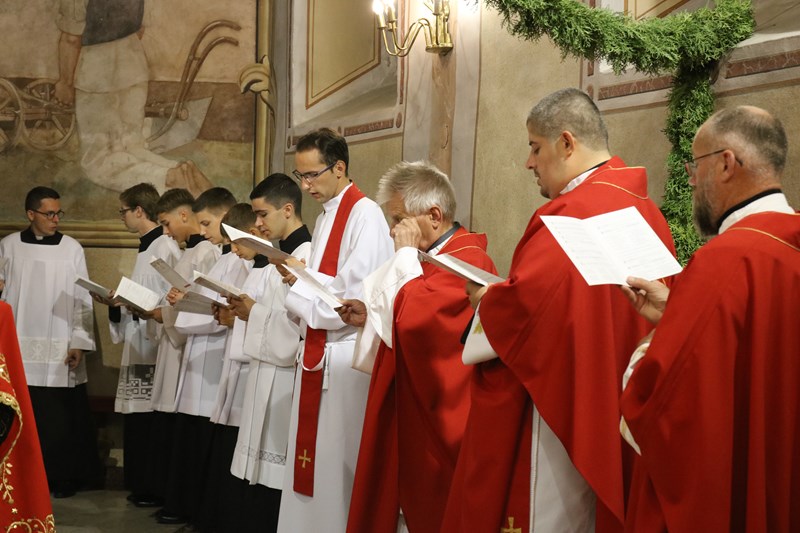 Mons. Perčić svoju je homiliju započeo promišljanjem o simbolici crvene liturgijske boje koja podsjeća na Kristovu Krv prolivenu za naše spasenje