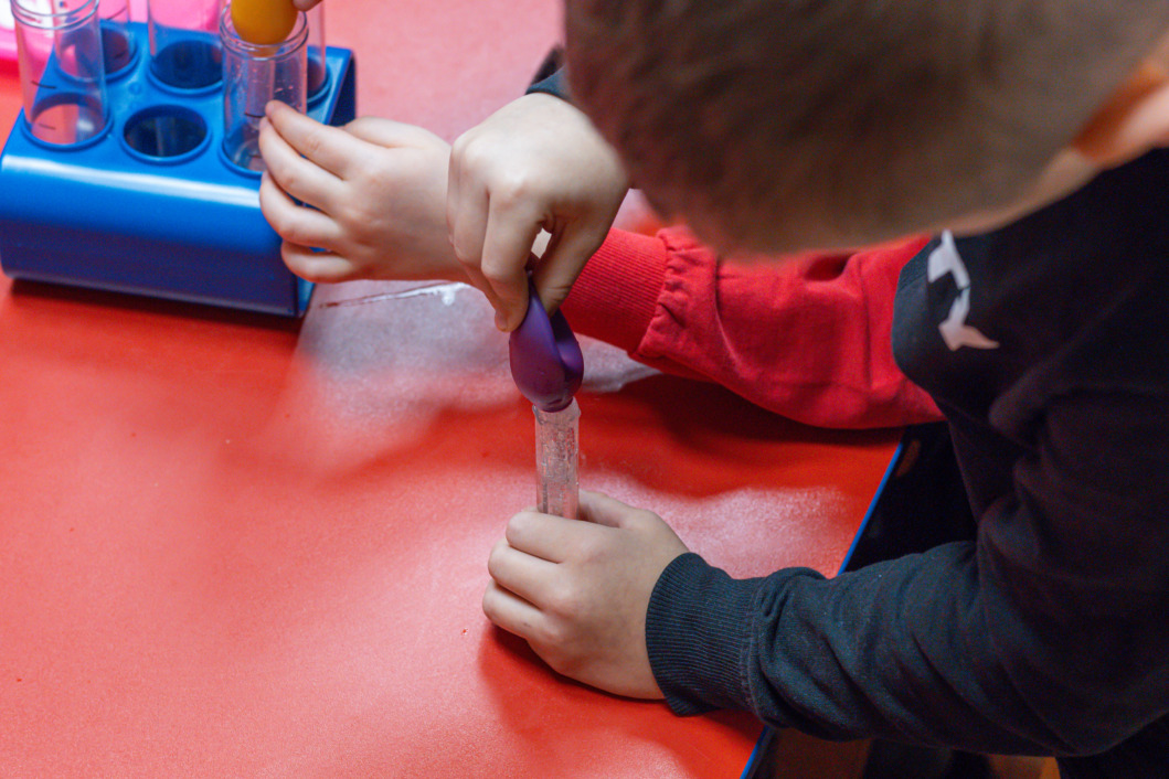 Oduševljeni i zainteresirani za novi pokus, mališani su zasukali rukave i krenuli izvoditi pokus za koji im je bio potreban ocat, soda bikarbona, žlice, epruvete, baloni i lijevak. Posebno nas je nasmijalo i razveselilo pitanje kako se zove predmet za lakše prelijevanje, a kreativni odgovori su nas oduševili – uljevka, taperver, prolijevalka, tetrapak…