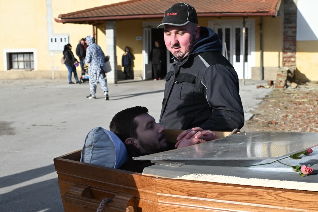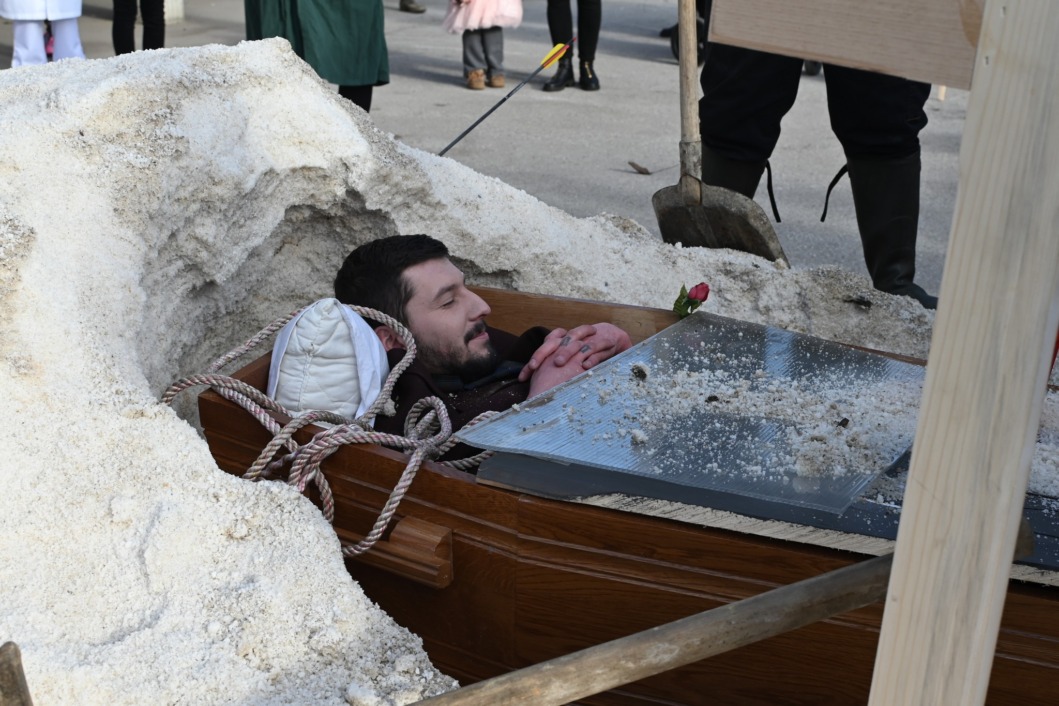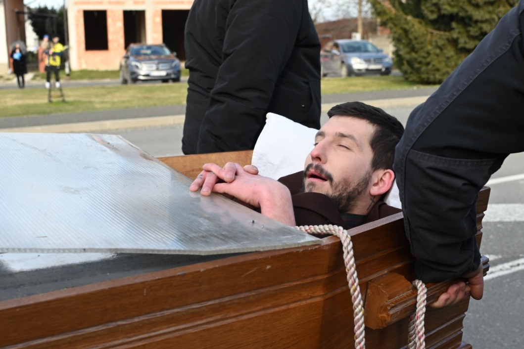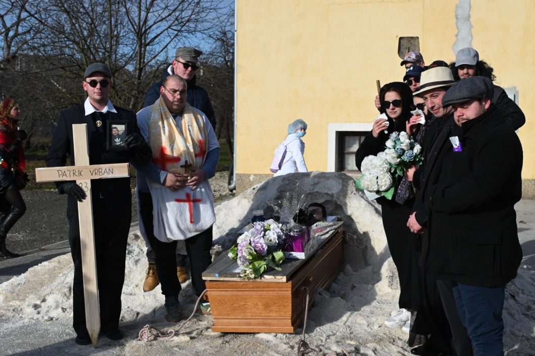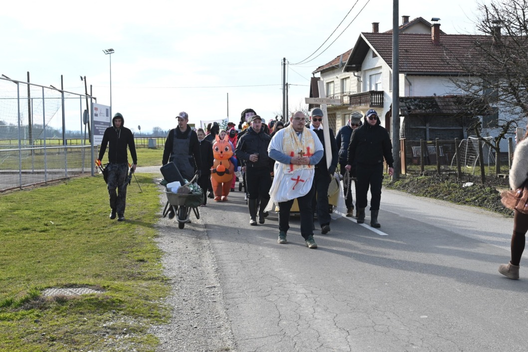 Scena je izgledala kao prava sprovodna povorka, ali uz osmijehe, dobacivanja i pokoji smijeh koji se nije mogao suspregnuti. ‘Pokojnik’ je, prema svemu sudeći, bio itekako svjestan svoje uloge, a cijela ideja zamišljena je kao duhovita pokladna dosjetka – simbolično ispraćanje svega lošeg iz protekle godine.