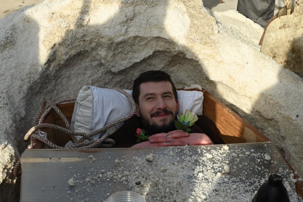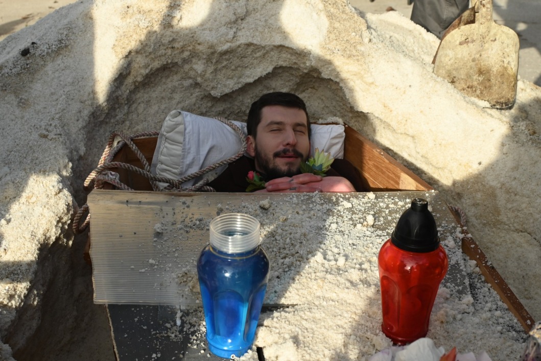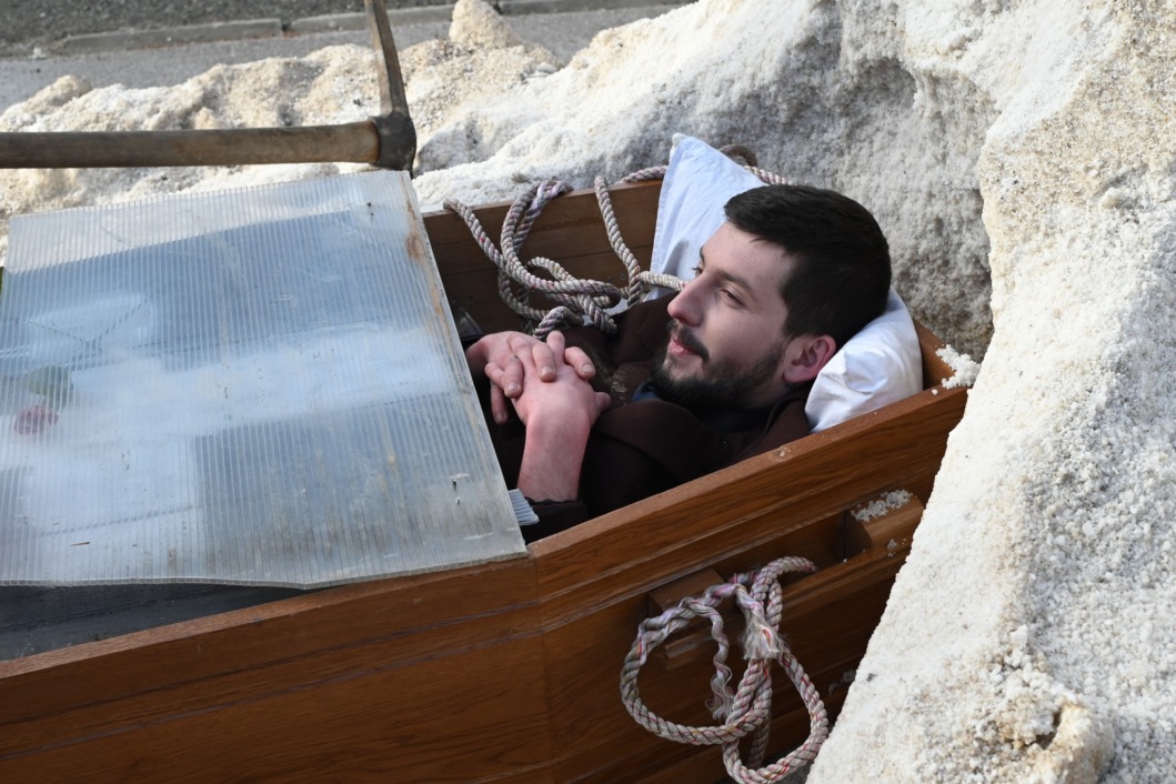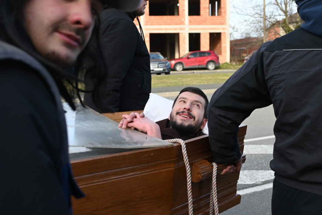Najveća atrakcija povorke bio je njezin početak. Na čelu je, sasvim ozbiljno, hodao svećenik. Ispred lijesa. A u lijesu? Živi čovjek.