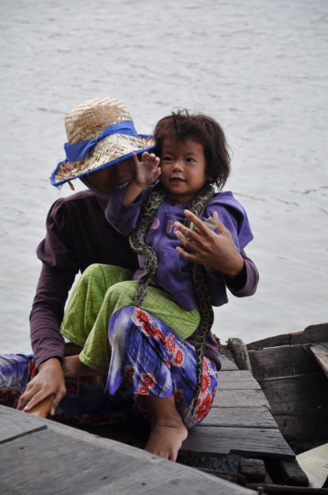 Djeca se snalaze ne bi li od turista dobili koji dolar. Vidjeli nekoliko čamaca u kojima se voze djeca s egzotičnim kućnim ljubimcima. U pravilu su to zmije, koje su dvostruko veće od mališana. Ovdje kažu da su to bezopasne zmije koje love miševe po kući, no ima tu i pitona i svakojakih zmijskih beštija. Zmije su im ovijene oko vrata, voze se s djecom u čamcu, a ovo pokazivanje turisti nagrađuju napojnicama. Očito da je u ovom svijetu siromaštva ovo dodatna zarada. Snimamo majku s malim djetetom, a ona za snimanje od nas očekuje dolar.