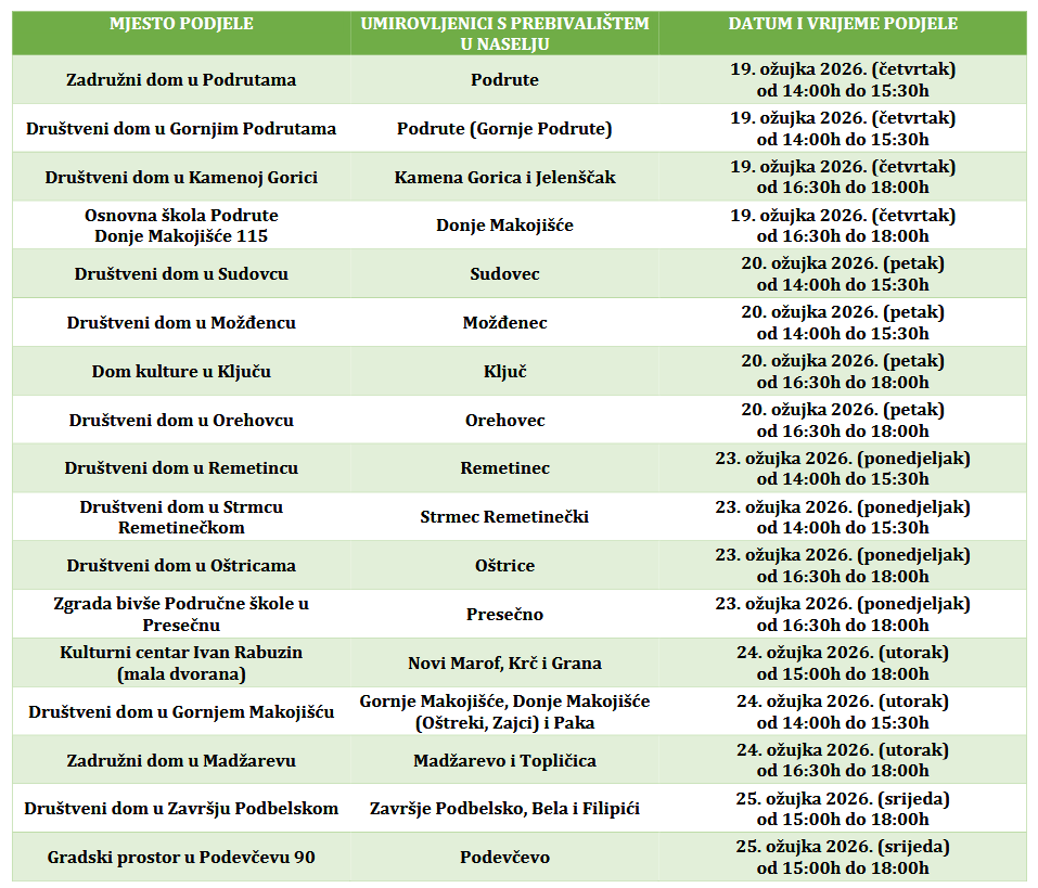 Umirovljenici koji su spriječeni preuzeti uskrsnicu u terminu po utvrđenom rasporedu prema prebivalištu, uskrsnicu će moći podići isključivo od 26. do 27. ožujka u Gradu Novom Marofu na adresi Varaždinska ulica 5, Novi Marof, II. kat, soba 7, od 8 do 14 sati.