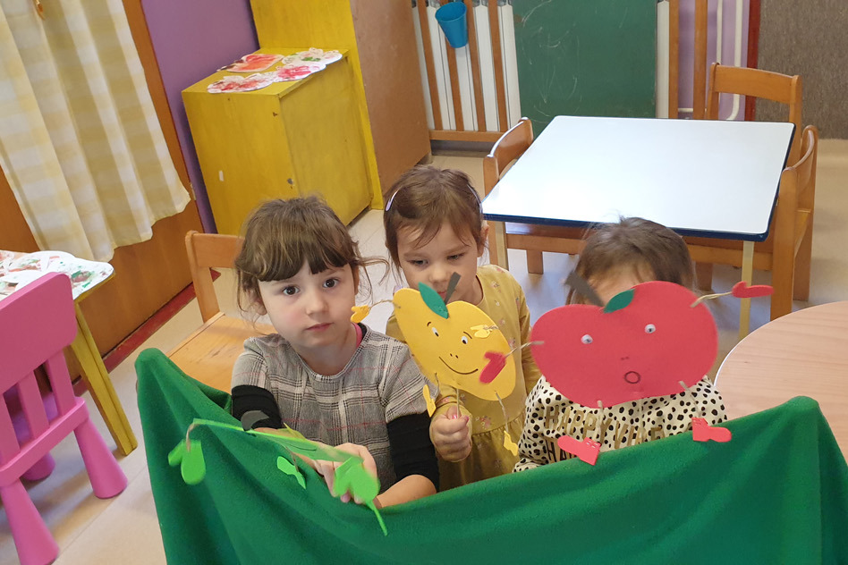 Mališani su se tako sa svojim odgojiteljicama zabavili glumeći u kratkoj i veseloj dramatizaciji Tri jabuke, igrom uz pjevanje Jula i jabuka te prikladnim likovnim aktivnostima.